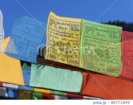 中国雲南省徳欽県 梅里雪山の山並みとタルチョ / Deqin, Yunnan, China