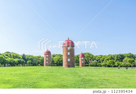 北海道 根室市 夕方の明治公園(3基のサイロ)
