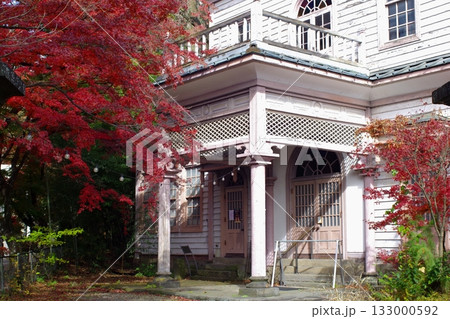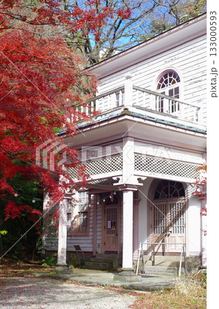 福島県白河市南湖公園内にある明治記念館と紅葉
