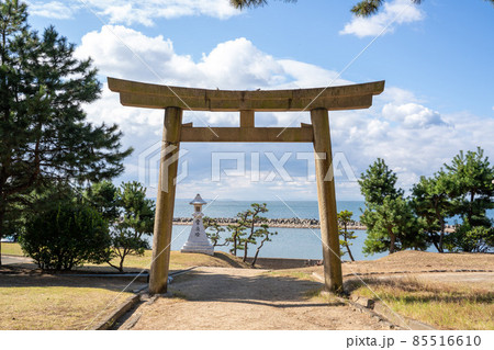 明石・住吉神社の鳥居越しに見る魚住港、名勝・錦ヶ浦の夕凪