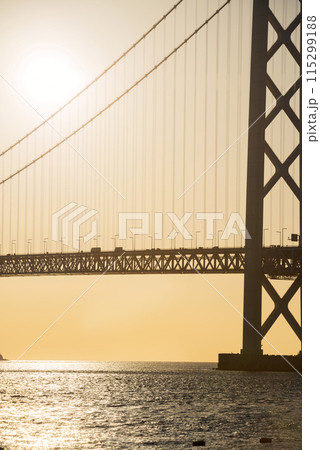 春の舞子公園から見た明石海峡大橋と夕日 兵庫県神戸市