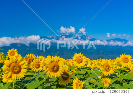 山梨県北杜市明野町浅尾 明野サンフラワーフェスの満開のひまわり畑と南アルプスの山々