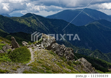 朝の南アルプス・イザルガ岳付近の縦走路を行く登山者と茶臼岳・上河内岳