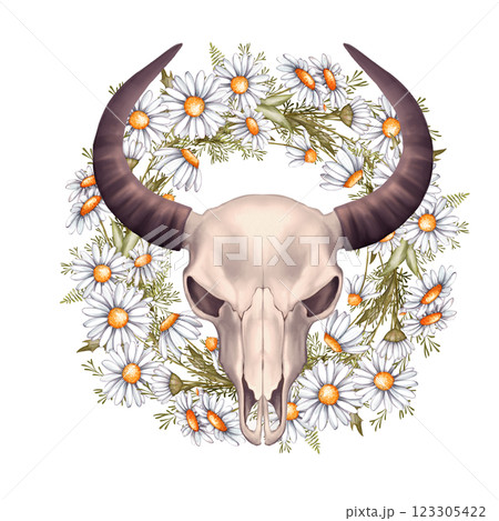 Bohemian bull skull. Western bull with daisy flowers. Isolated on white. Boho skull style. Hand drawn illustration.