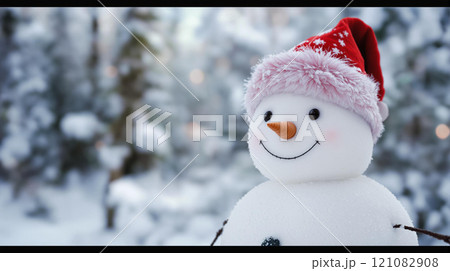 寒假聖誕節背景橫幅 — 戴著羊毛帽和圍巾的可愛滑稽的笑雪人特寫