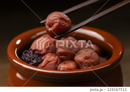 箸で持ち上げられた壺入りの梅干し