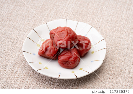 ガラス皿に盛り付けた複数の梅干し