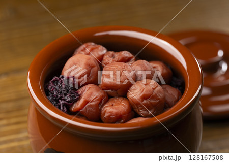 白背景に映える壺入りの梅干し
