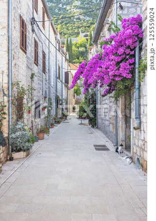 Ston, historic town in Peljesac peninsula in Croatia, Europe. Charming European street with stone buildings, bright purple bougainvillea, and cats lounging in the sun.