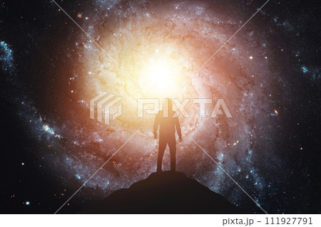 Silhouette of a man on the top of a mountain against the background of the galaxy