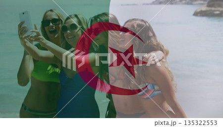 Smiling group of four women taking selfie at sandy shore, with smartphone and crescent star symbol