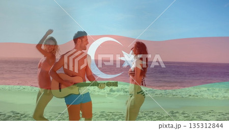 Three friends wearing swimwear playing guitar and dancing at beach water's edge, with flag overlay