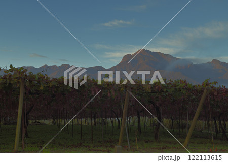 北杜市白州町、収穫間近の甲州ブドウの朝のブドウ園