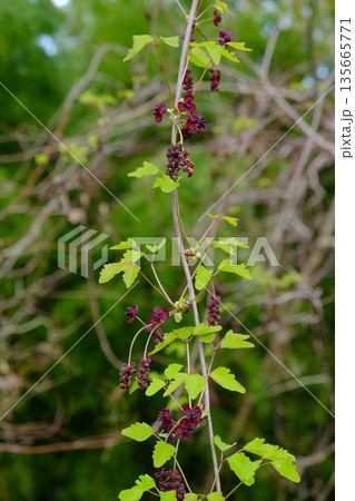 自然 植物 カショウクズマメ、林縁の木々に這わせたつるから花の塊が垂れ下がっています
