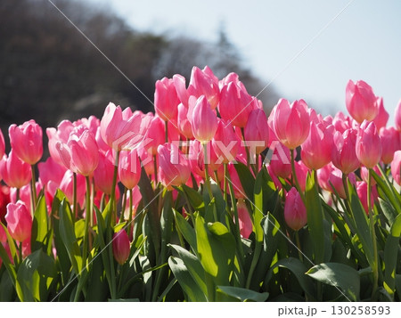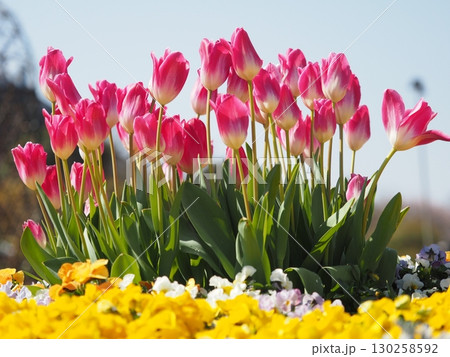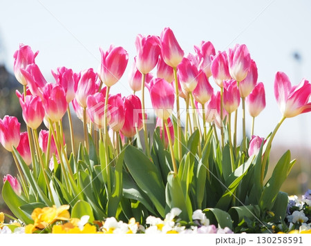 春の日差しを浴びて咲く満開のチューリップ