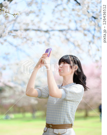 桜の下でスマートフォンで写真を撮る若い女性