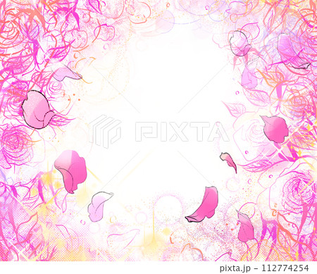 少女漫画風キラキラ輝く星々とピンクの薔薇と百合と花びらが舞うペン画カラーイラストと白背景