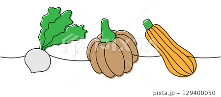 Fresh turnip, autumn pumpkin, zucchini one line colored continuous drawing. Fresh organic vegetables. Vector illustration