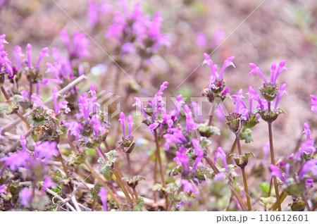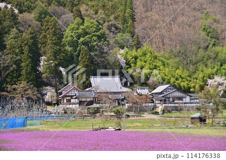 ホトケノザの赤紫色の絨毯と法泉寺の建物