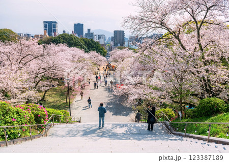 people view sakura tree tunnel and Fukuoka city view at Nishi park