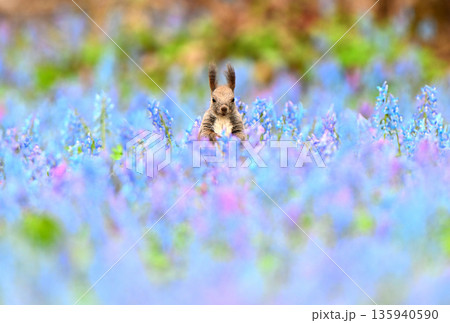 北海道浦臼神社のエゾエンゴサクとカタクリの花畑で食事をするエゾリス