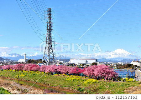 茅ヶ崎小出川土手に咲く河津桜と菜の花と富士山