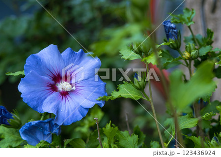 Beautiful hibiscus bush with blue flowers in the garden