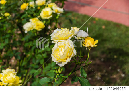 明るい光の中ばら園でバラが咲いている