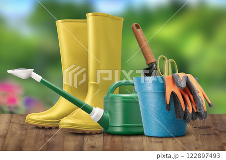 庭のウッドデッキの上に置かれたガーデニングツール