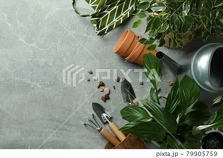 Concept of gardening on gray textured background