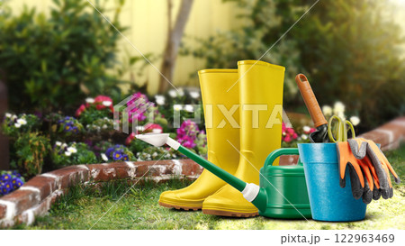 庭の花壇の前に置かれたガーデニングツール