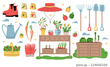 Set of hand drawn garden elements. Cartoon flat illustration of farm equipment, agriculture items
