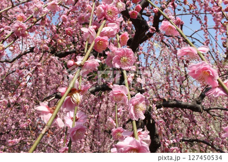 青空を背景にピンク色の枝垂れ梅が咲いています