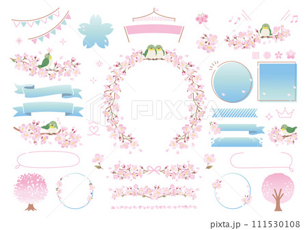 桜のフレームと枝にとまるメジロのイラスト(文字なし)