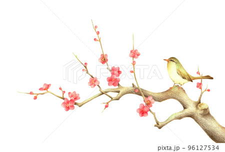 紅梅の枝に止まるうぐいすの背景 横 手描き色鉛筆画