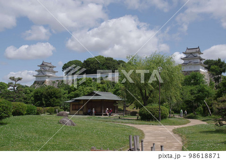 明石城石垣の上にある坤櫓と巽櫓と武蔵の庭園の御茶屋