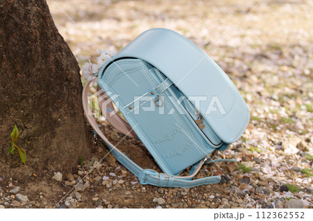 桜の木の下の水色のランドセル。春、入学イメージ