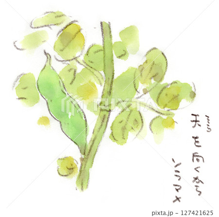 梅雨〜初夏の植物、収穫時期に近くなると空を向くからソラマメ(空豆)の水彩画イラスト
