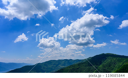初夏の青空のもと、山頂に流れるたくさんの白い雲