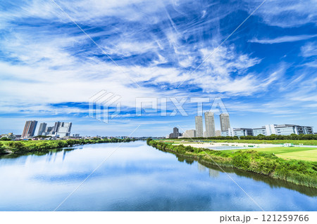 夏の多摩川・ガス橋から望む武蔵小杉や下丸子の都市風景【神奈川県・川崎市-東京都・大田区】