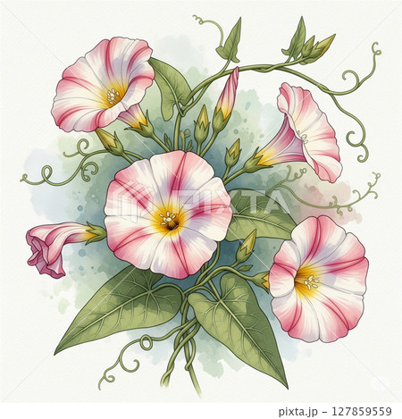 日本的な昼顔の花のイラスト、ボタニカル、水彩画