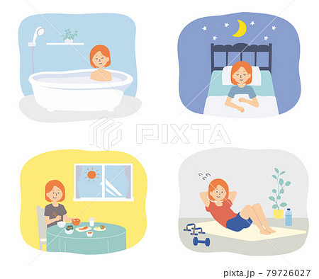 幼稚園、保育園くらいの幼児の1日のイラストセット(女の子)