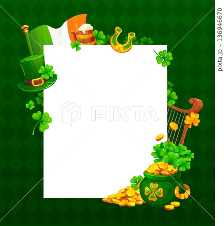 Happy St Patrick's day holiday greeting card frame. March party vector greeting card, Saint Patrick holiday invitation or banner border with leprechaun hat, Ireland flag and horseshoe, pot with gold
