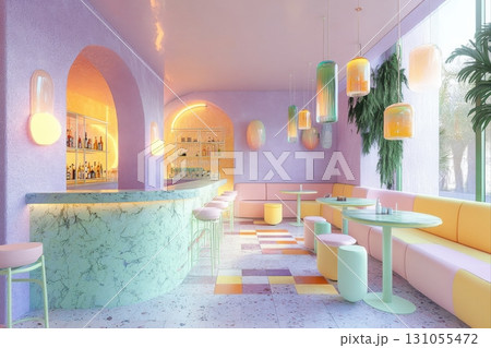 Explore chic bar interior design in urban space with elegant pastel decor and contemporary vibes