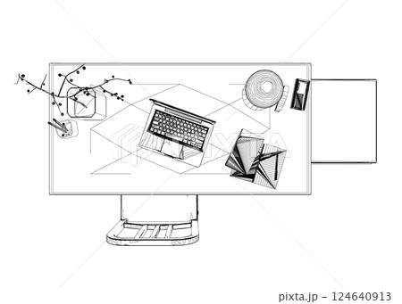 Empty Workplace outline, Desk Chair Computer Workspace Office No People. Office workplace flat design. Creative workplace modern open space empty nobody office interior contemporary