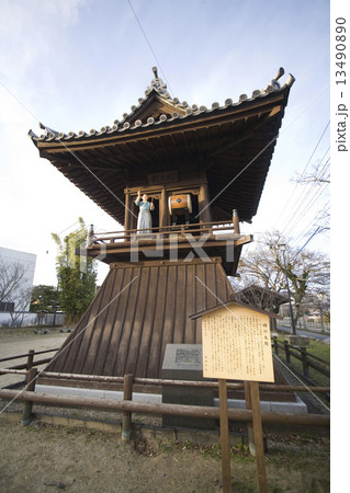 金刀比羅宮大門前の 時太鼓を備えた「鼓楼」とその左横にある石碑「清塚」(江戸時代より清少納言の墓と伝わる)