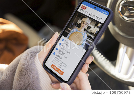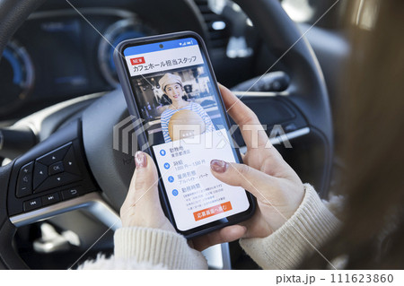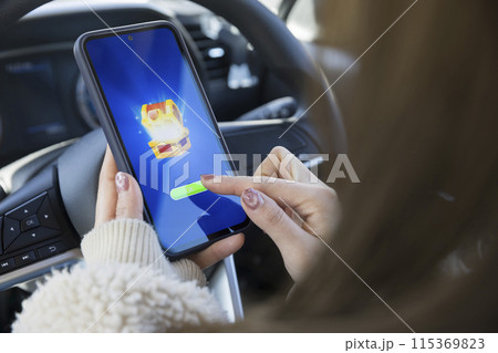 車の中でスマホゲームをすてガチャをひく若い女性手元