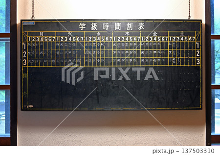 古い木造校舎の壁に掲げられた手書き文字が残る学級時間割表の黒板