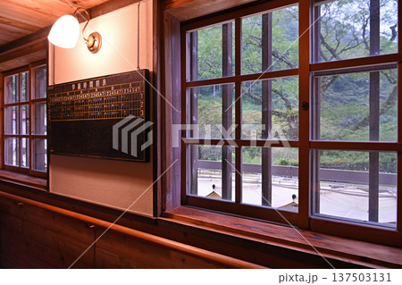 雨の日の窓辺を照らす明かりと壁に掲げられた古い学習時間割表