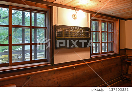温かい明かりが灯る窓際の壁に掲げられたレトロな学級時間割表の黒板